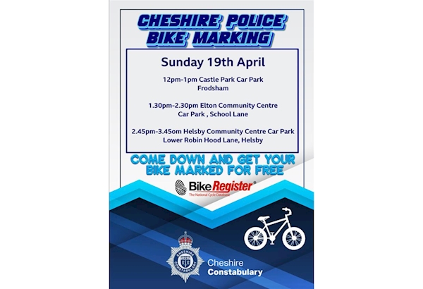 Your local Safer Neighbourhood Team will be holding a Bike Marking event at Elton Community Centre car park, School Lane, Elton on Sunday 19th April between 1:30pm and 2:30pm . Please take this opportunity to raise any concerns you may have and to find out what we are doing to tackle the issues that matter to you.